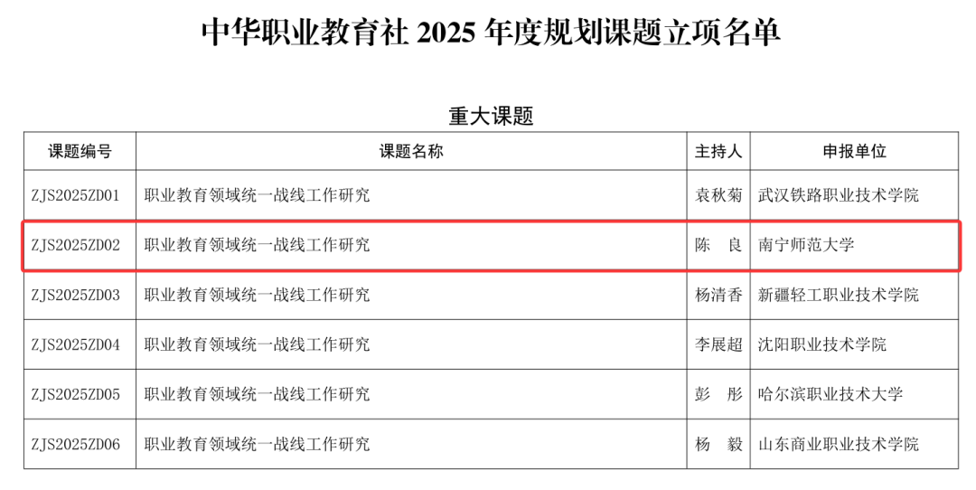 近日,中华职业教育社公布了2025年度规划课题拟立项名单。我校职业技术师范学院陈良教授主持申报的课题《职业教育领域统一战线工作研究》获中华职业教育社2025年度规划重大课题立项,这是广西首次获得此类课题重大课题立项,是我校在职业教育领域研究的又一重大突破。