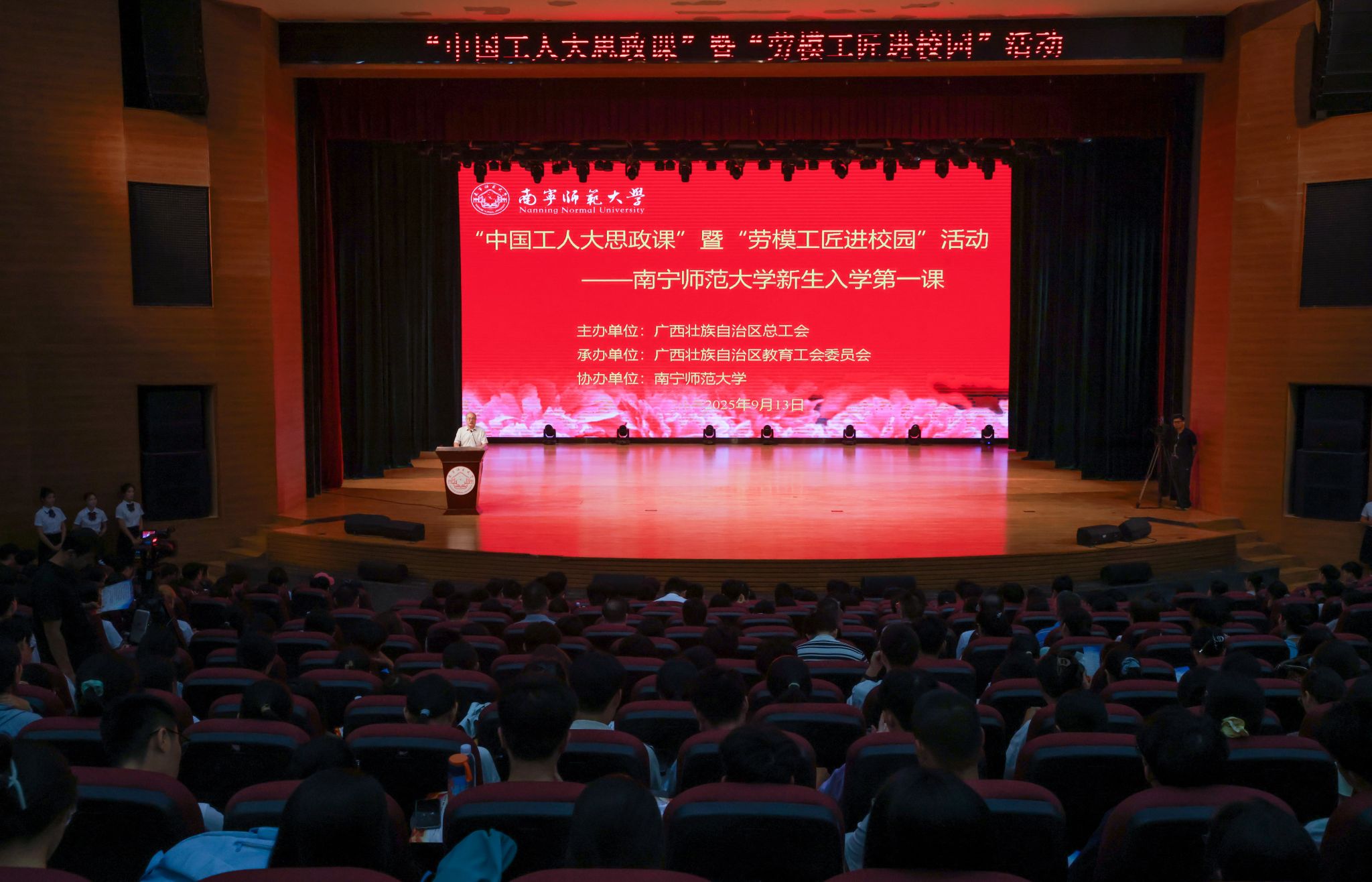 9月13日上午,我校在武鸣校区音舞楼报告厅举行“中国工人大思政课”暨“劳模工匠进校园”活动。活动以“弘扬劳模精神 铸就师者匠心”为主题,由广西壮族自治区总工会主办,广西壮族自治区教育工会承办,南宁师范大学协办。自治区教育工会主席韦孟奇,学校总会计师、校工会主席梁家斌出席活动并致辞。