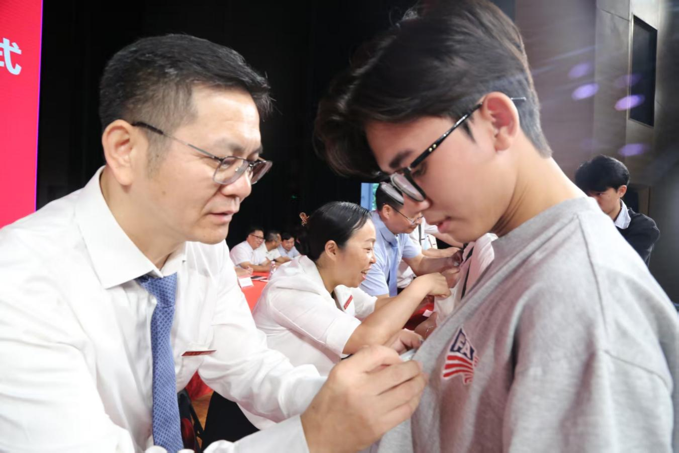 学校副校长龙妮娜为新生代表佩戴学校徽章