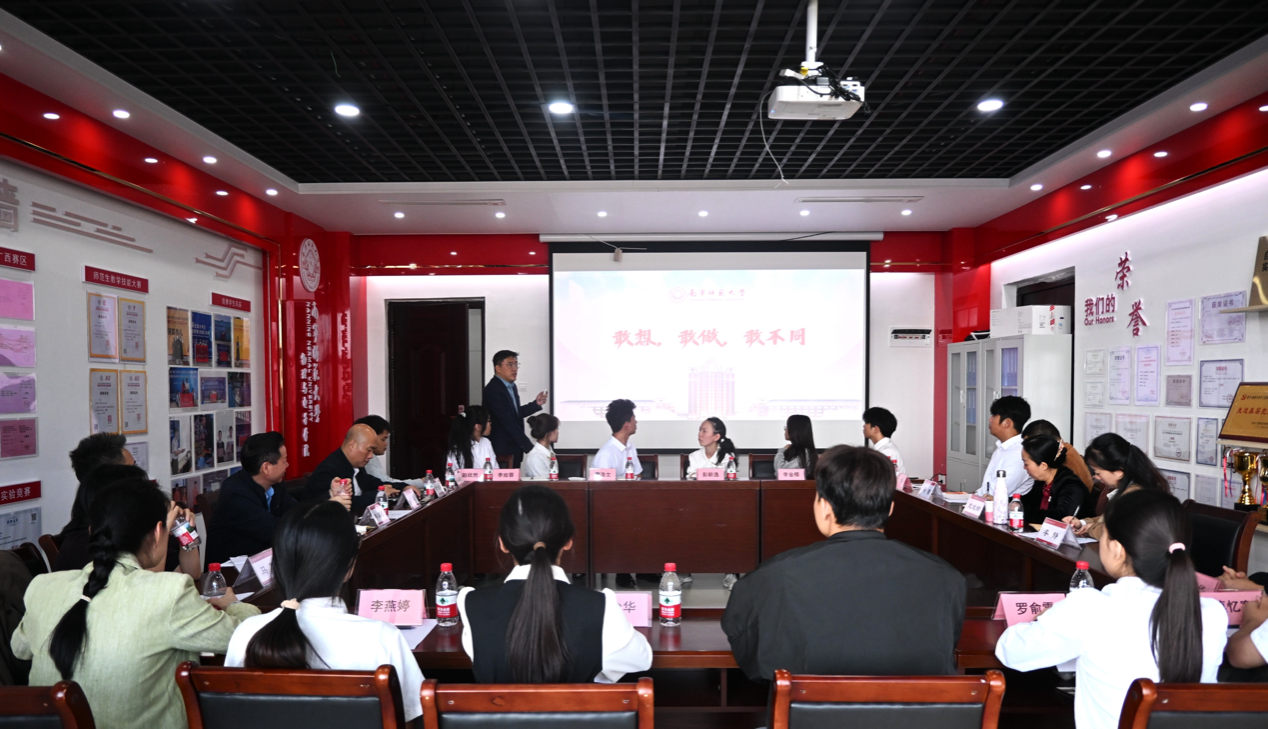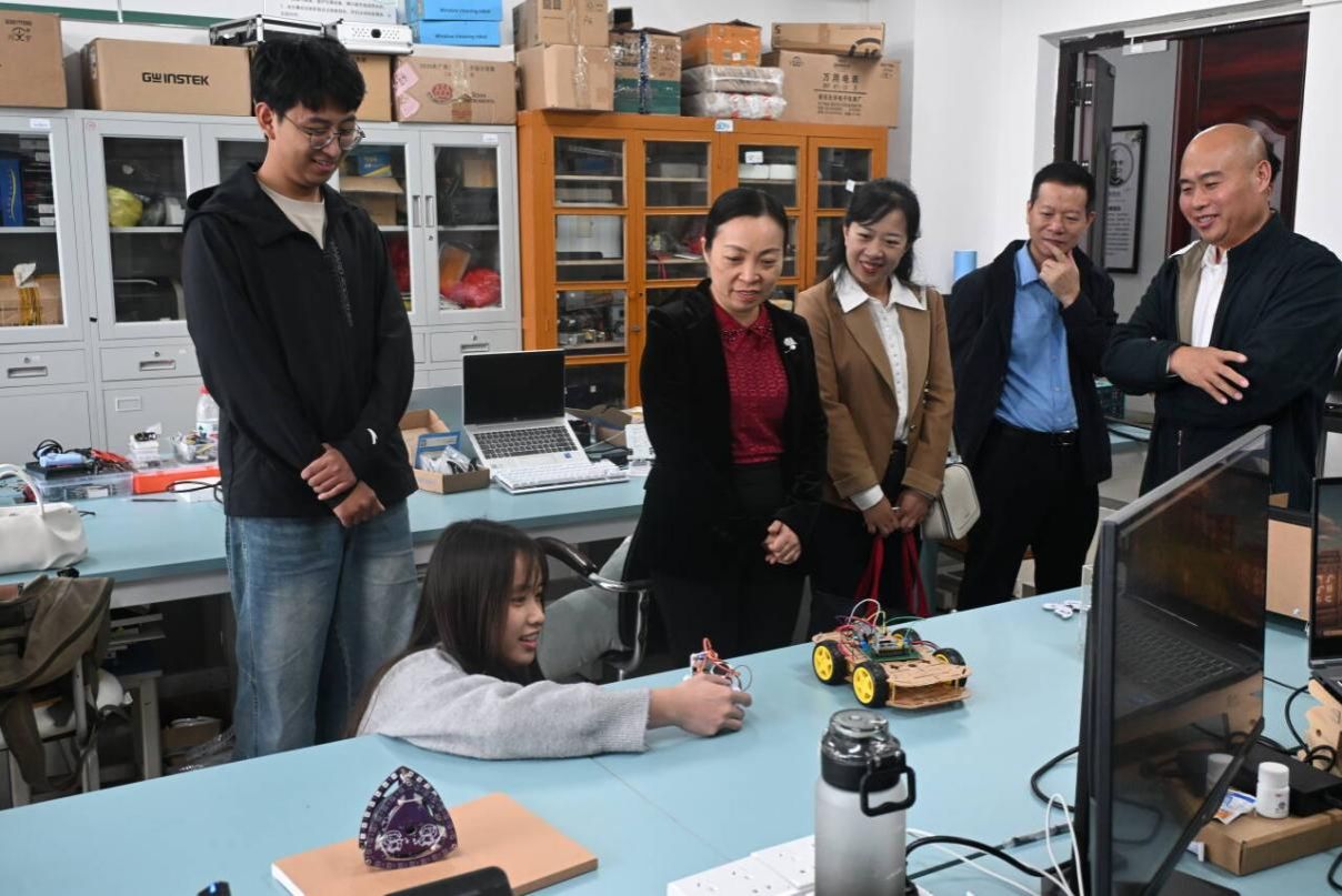 座谈会前,龙妮娜一行走访了物理演示实验室、电子竞赛实验室、科学探究俱乐部等多个实验教学与创新实践基地,认真听取了指导老师和同学们对各类参赛作品的介绍,对已取得的成绩表示赞许,并鼓励大家要进一步丰富拓展创新实践平台建设,充分发挥好特色创新平台的育人作用,吸引、带动更多的师生参与到各类科技创新项目活动中来,研发出更多兼具创新性与实用性的科技成果,在动手实践中培养创新思维,让所学知识在解决实际问题中发挥更大价值。