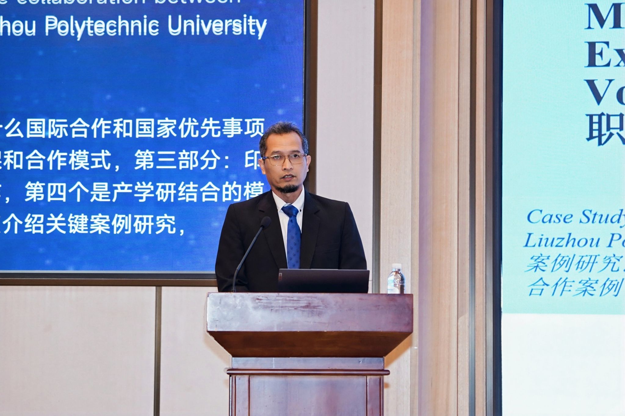 Dr. Zaw Myint(佐敏博士)线上致辞。他简要介绍了当前缅甸职业教育发展的重点方向,期望与中国—东盟职业教育研究中心、中国高校、产业界伙伴深化合作,通过联合开展师资培训、共享数字化学习资源与设施、交流专业经验等多种形式,共同构建中国—东盟区域职业教育协作网络,为促进区域共同繁荣打造坚实的基础。