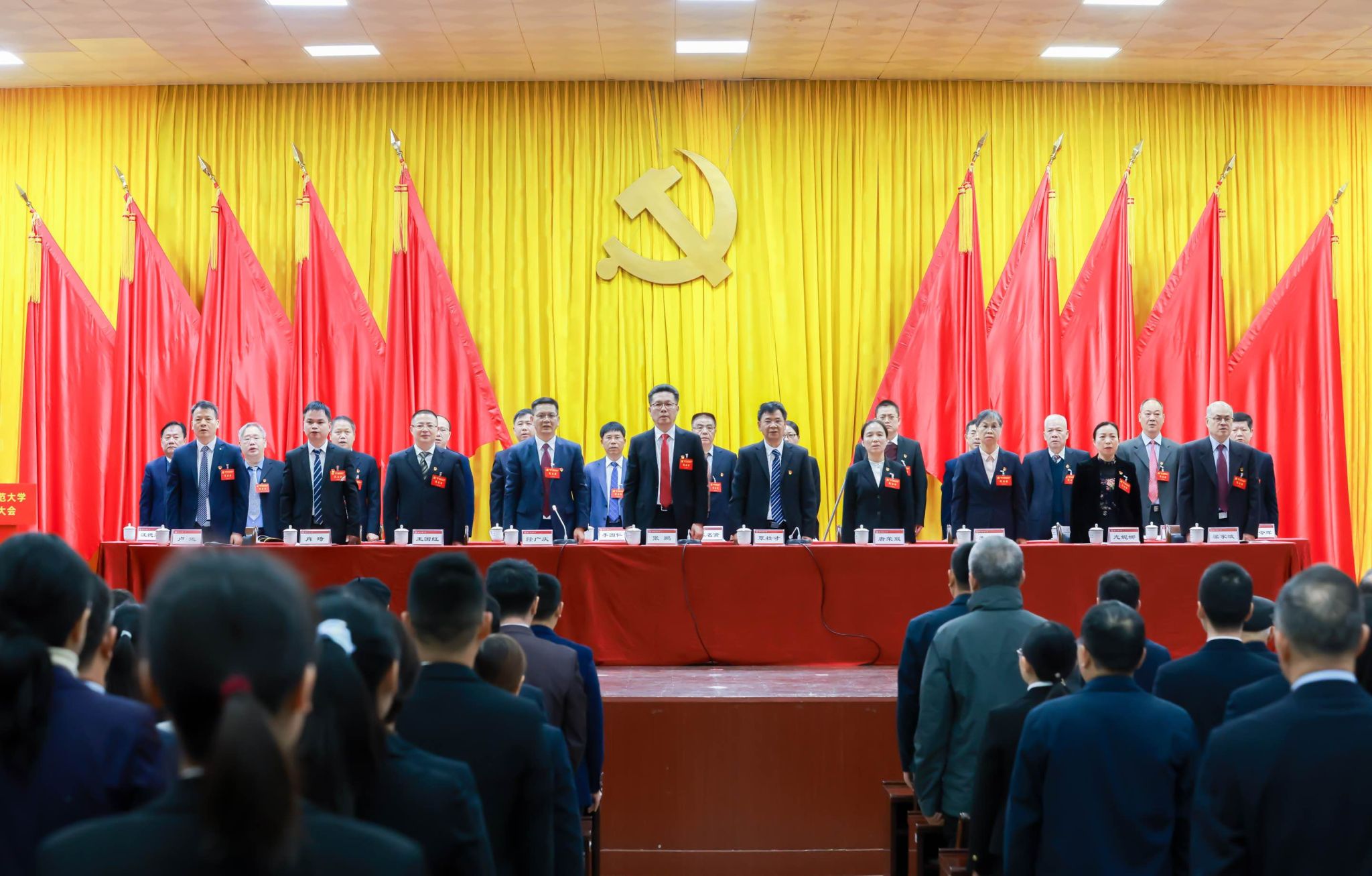 大会执行主席、学校校长隆广庆宣布中国共产党南宁师范大学第一次党员代表大会开幕。全体起立,奏唱中华人民共和国国歌。
