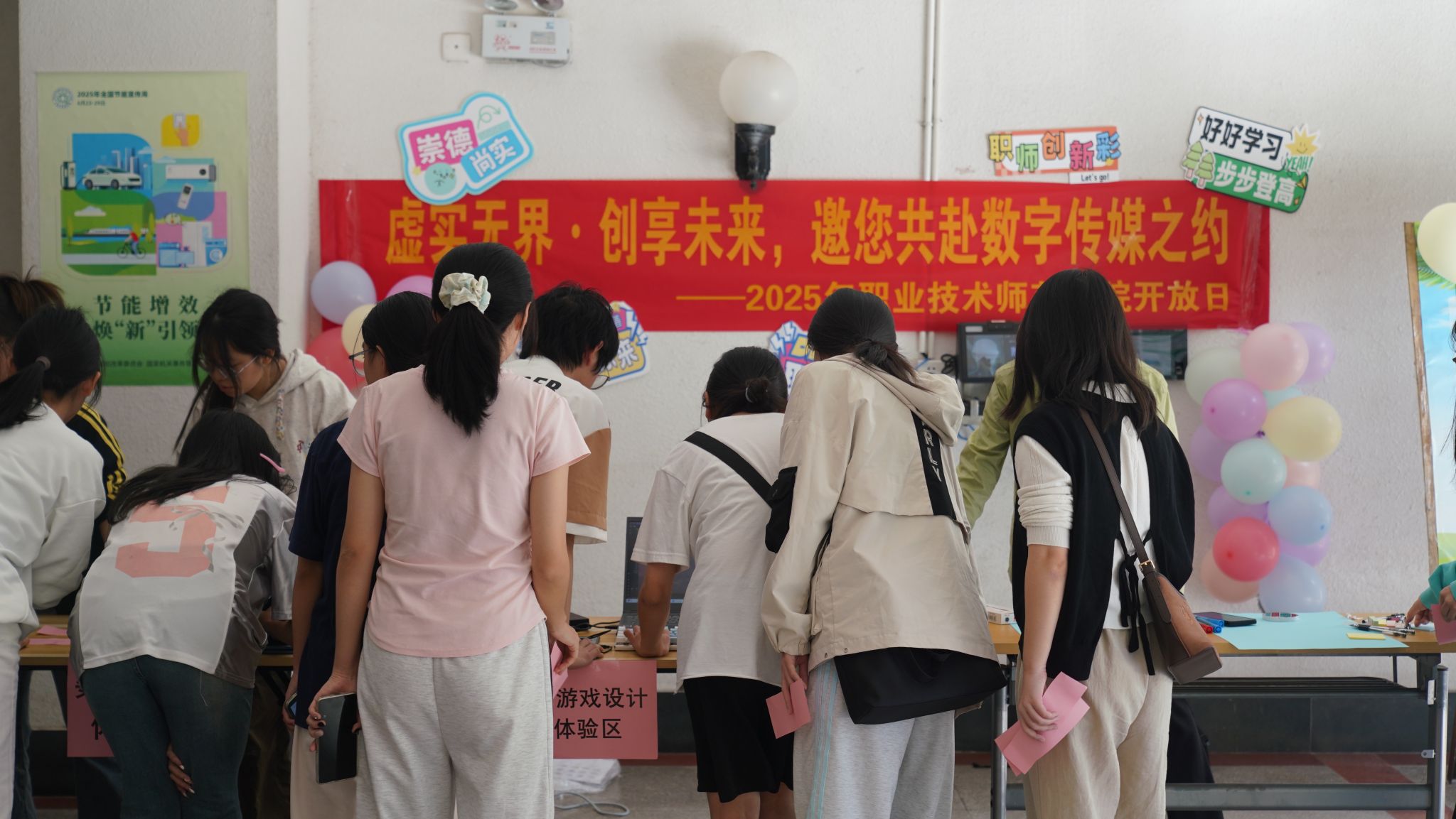 开放日活动以“学科优势”为核心,22个学院围绕各自特色方向、科研成果、实训平台等,全方位“亮出家底”,精心设计多元化互动环节,将抽象的学科魅力转化为可触、可感、可参与的沉浸式体验。马克思主义学院带领同学们领略了马克思主义理论教育广场、党史育人画廊、科学社会主义发展史教育馆及广西新时代爱国主义教育虚拟体验中心,让马克思主义理论变得鲜活生动;物理与电子学院科学探究俱乐部讲解了“超导磁悬浮”“平面镜成像”“麦克斯韦滚摆”等实验的原理,点燃同学们的探究热情;人工智能学院将无人机搬到室外,让同学们观看了无人机飞行演示并体验实际操作,领略了人工智能领域的技术运用;新闻与传播学院通过“校园电视节目录制体验”“专业配音设备实操”“网台工作全景解析”三场沉浸式实践活动,让大家在亲身参与中感受新闻传播的独特魅力……