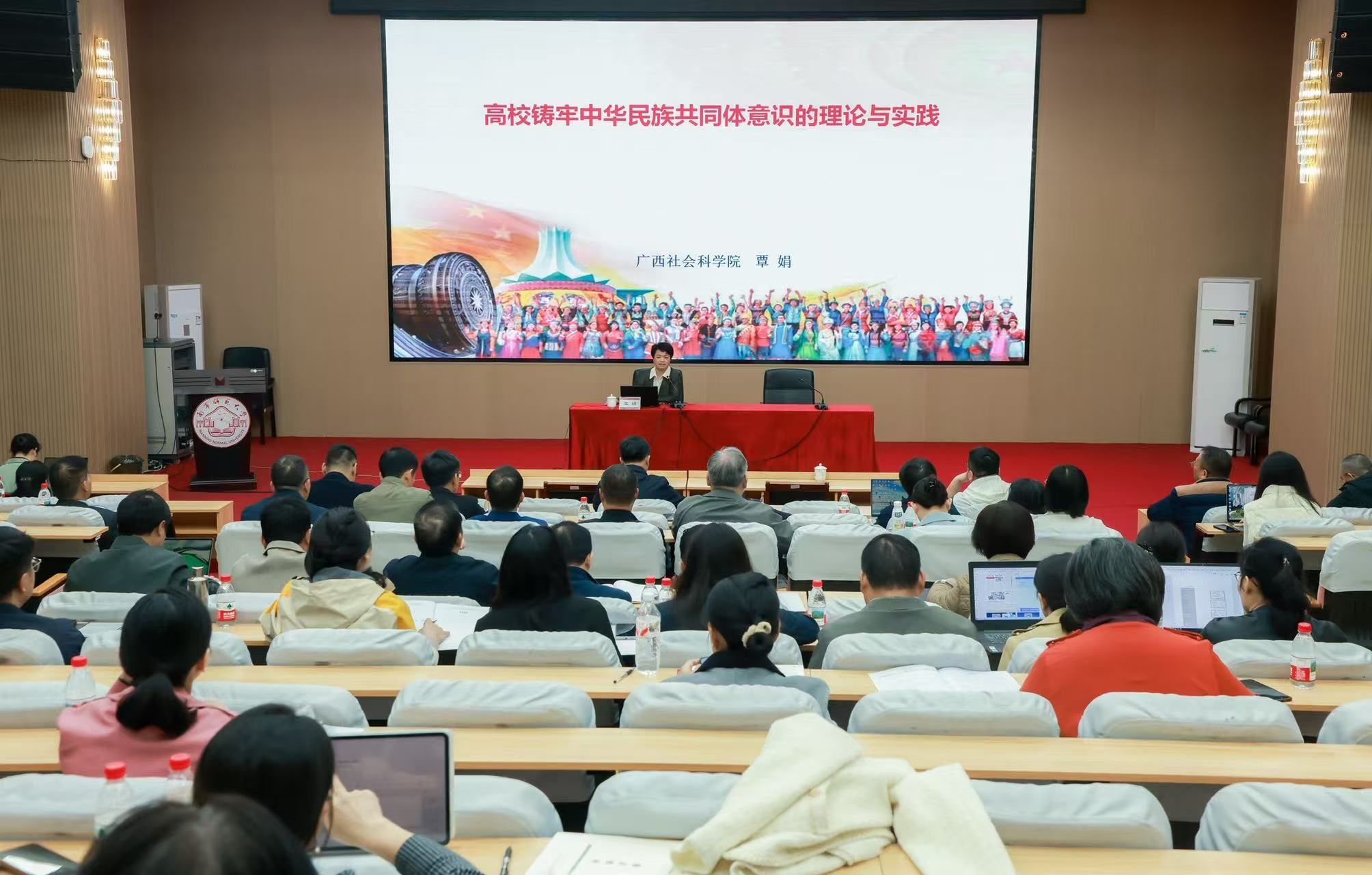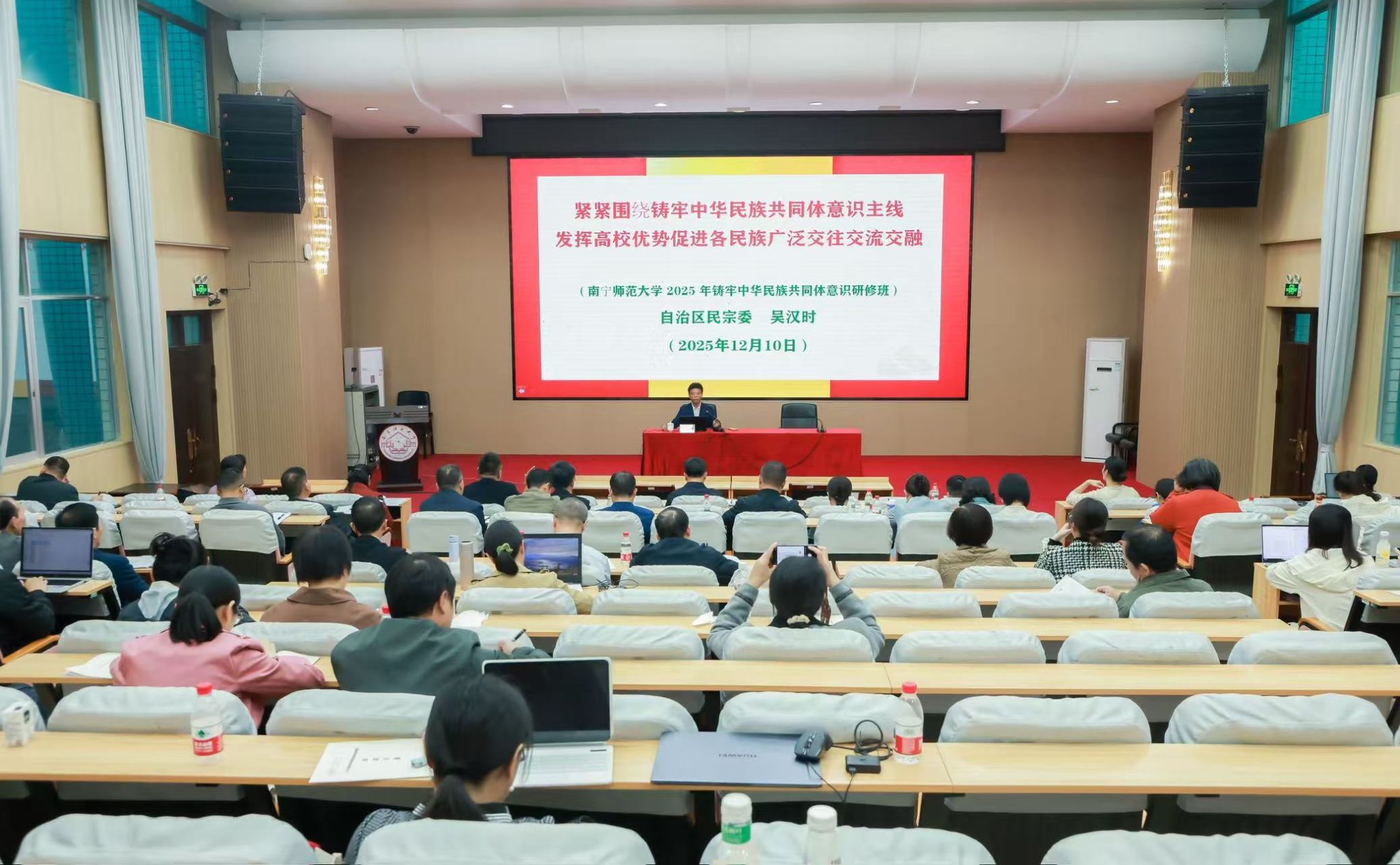 为深入学习贯彻党的二十届四中全会和自治区党委第十二届十一次全会精神,全面落实习近平总书记关于加强和改进民族工作的重要思想以及对广西工作论述的重要要求,12月10日,由学校党委统战部主办的南宁师范大学2025年铸牢中华民族共同体意识专题研修班在文星楼301报告厅正式开班。自治区民宗委二级巡视员吴汉时、广西社会科学院民族研究所所长覃娟研究员作专题授课。学校党委副书记唐荣双出席开班仪式并作动员讲话。