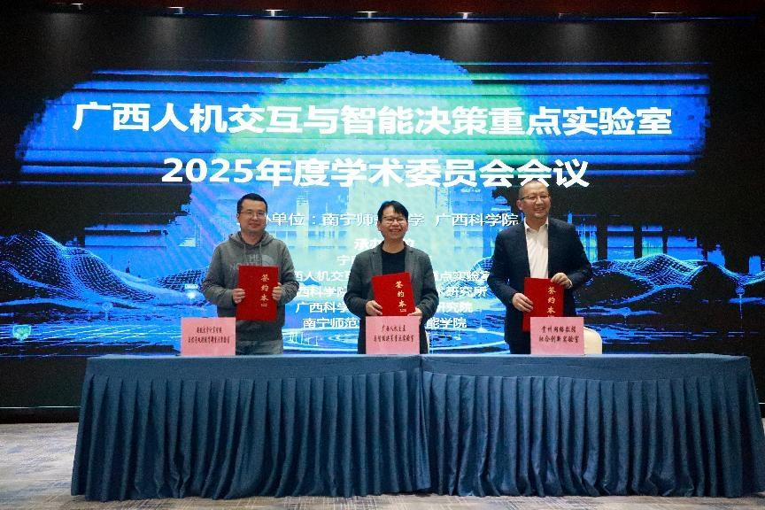 当天下午举行了广西人机交互与智能决策重点实验室2025年度学术委员会会议。我校校长隆广庆、广西科学院领导先后致辞,对实验室一年来取得的科研进展与贡献表示充分肯定,并对未来发展方向提出殷切期望。会上,举行了广西人机交互与智能决策重点实验室与贵州网络数据融合创新实验室、安徽大学计算智能与信号处理教育部重点实验室的三方共建联合实验室框架协议签约仪式,标志着跨区域协同创新迈出重要一步。