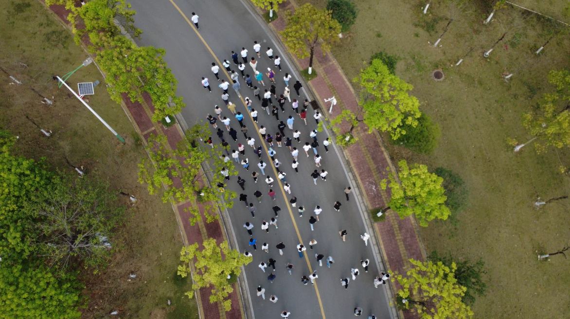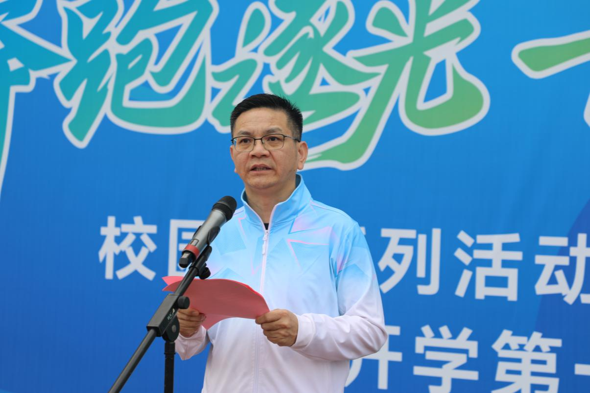 韦永丽带领全体师生进行热身运动,以自身经历诠释体育精神。热身结束后,发令号响起,由校领导、嘉宾和师生代表组成的队伍沿武鸣校区校道开跑,途经音乐与舞蹈学院、桂园食堂、全国大学生创新创业基地、实验楼、图书馆等地,最终返回松园体育场,全程约3.6公里。沿途不少学生驻足观看、加油助威。