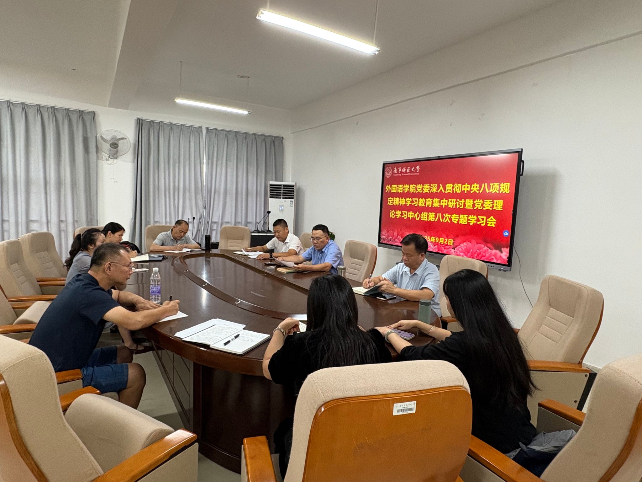 9月2日下午,外国语学院党委召开深入贯彻中央八项规定精神学习教育集中研讨暨党委理论学习中心组第八次专题学习研讨会。会议由学院党委书记苏华主持,学院党委委员、纪委委员参会,各教职工党支部书记列席会议。