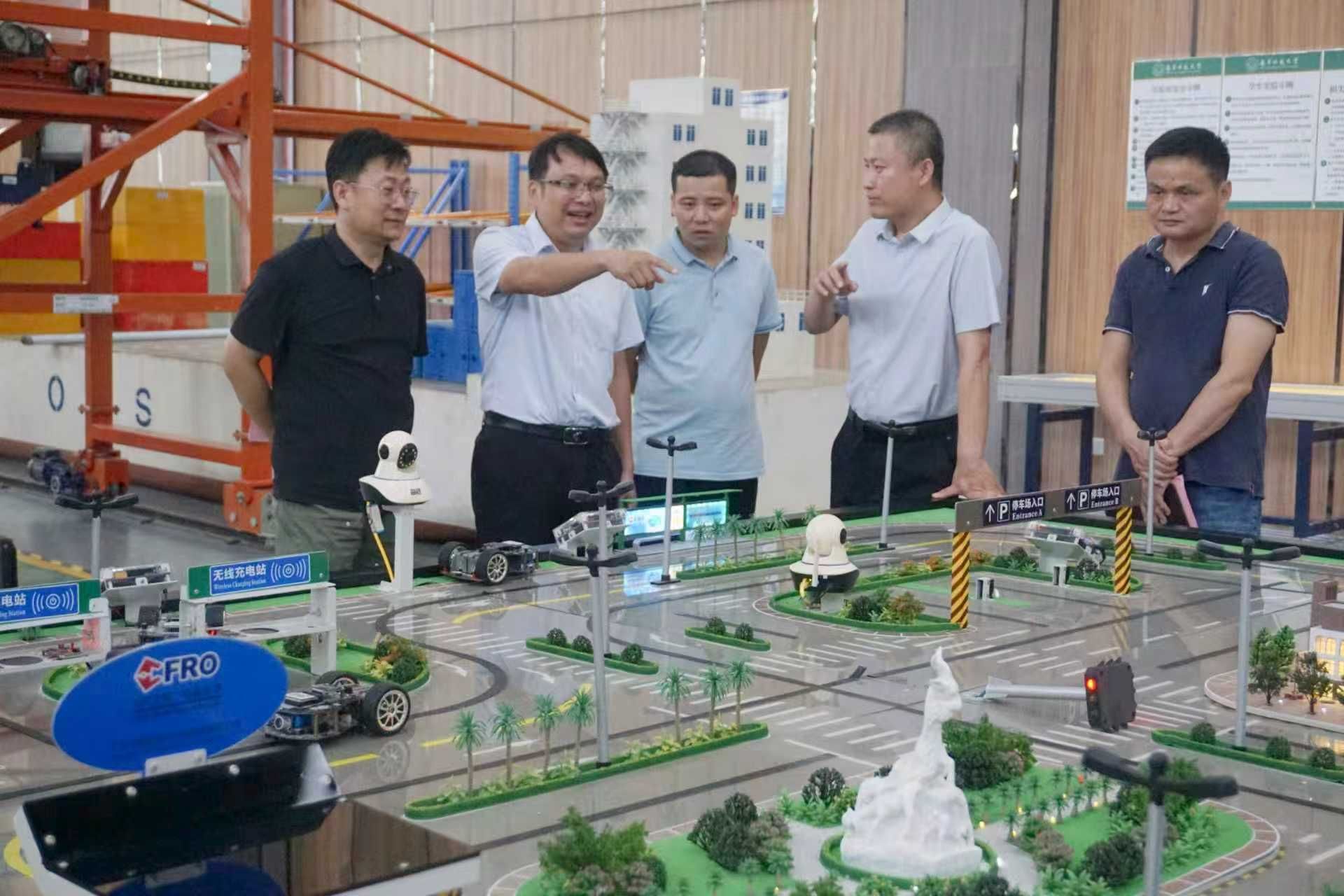 座谈结束后,双方来到实验室A107,参观了我院智慧物流实训中心。张培铭副总经理一行详细了解了各模块功能,重点观看了智能交通沙盘的城市物流配送动态演示,并鼓励中心持续推动产教融合,对接企业需求,为学生提供更贴近实际的实践平台,助力应用型人才培养。