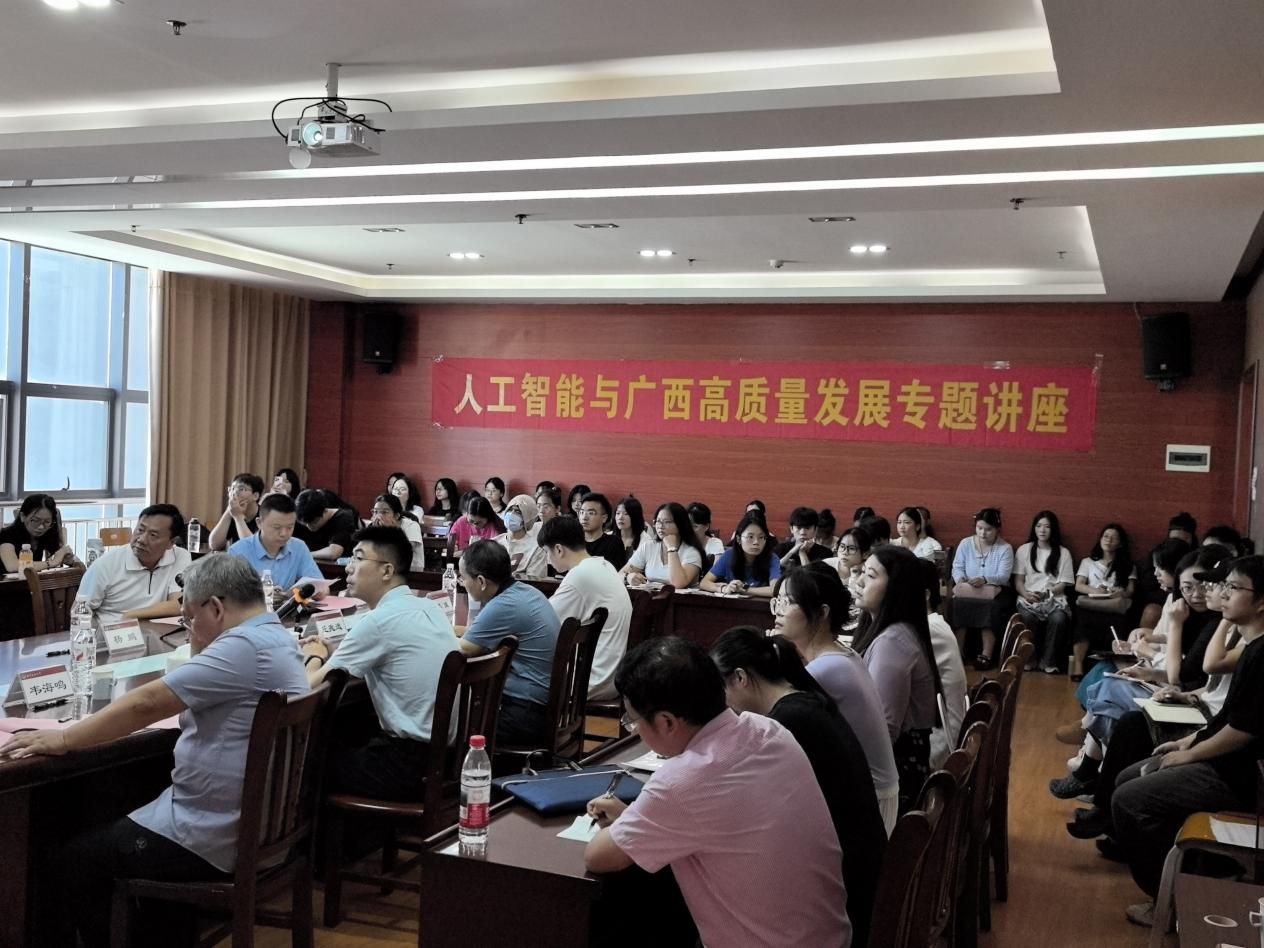 为深入学习贯彻习近平总书记关于人工智能的重要论述,贯彻落实自治区党委关于发展人工智能赋能千行百业的决策部署,聚焦人工智能与广西经济社会各领域融合发展的关键问题,探索高质量发展新路径、新动能。9月5日,由广西壮族自治区社会科学界联合会主办,广西区域科学学会与南宁师范大学经济与管理学院承办,广西区域与城市经济研究会协办的“人工智能与广西高质量发展”专题讲座在学校五合校区顺利举行。本次讲座由经济与管理学院党委书记韦海鸣教授主持,来自校内外专家、学者约60人参会。