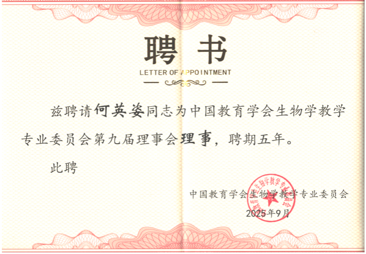 何英姿教授此次当选,是对其个人学术成就和教学贡献的高度肯定,也为我校在生物学教学领域赢得了更高的荣誉。何英姿教授表示,她将借助这一平台,进一步加强与全国同行的交流与合作,为推动我校生物学教学研究迈向新高度,助力广西生物学教育事业的蓬勃发展贡献更多力量。