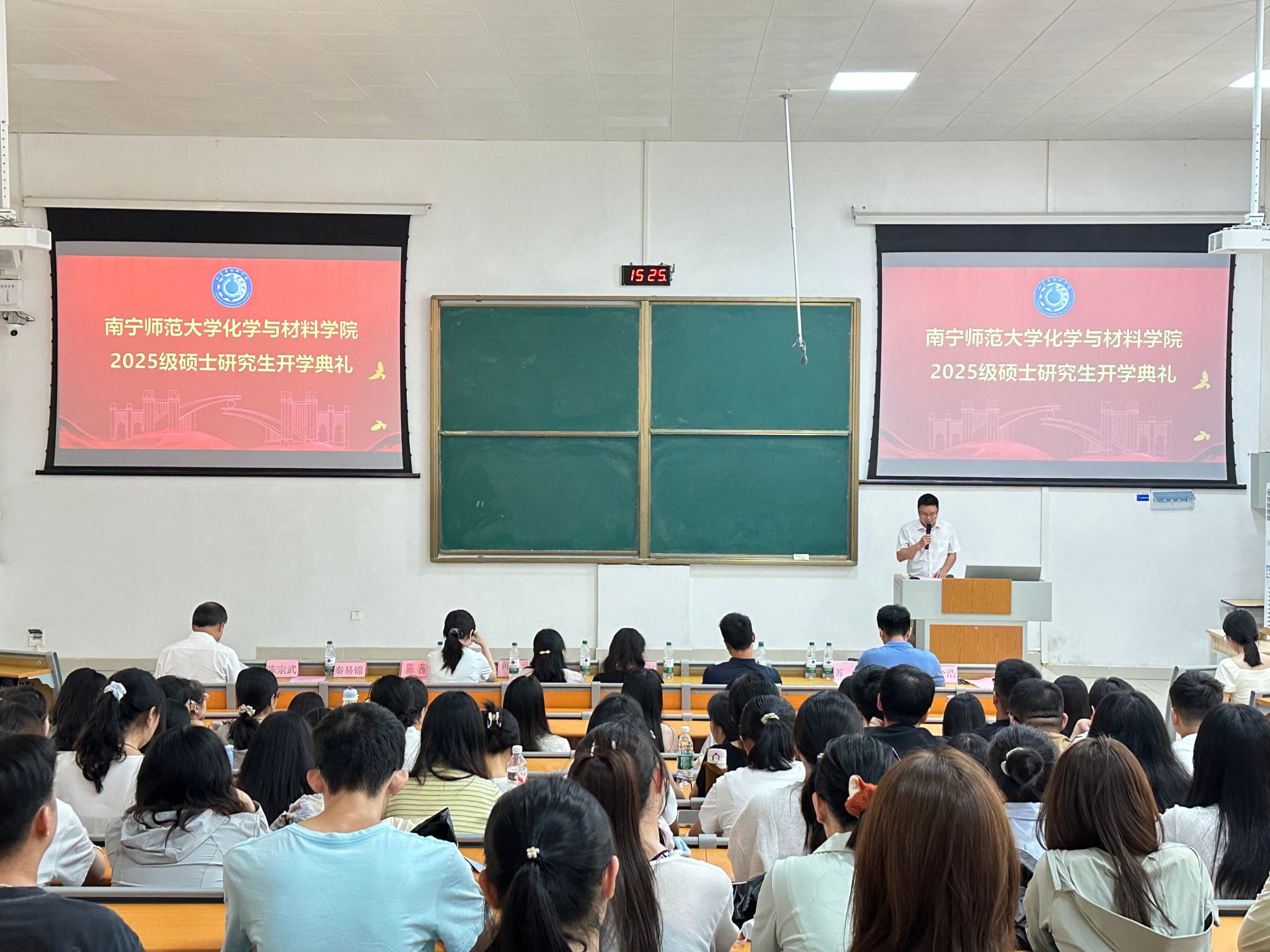 九月花香漫校园,筑梦新程正当时!为助力2025级硕士研究生明确发展方向、顺利开启研究生阶段新征程,化学与材料学院于9月9日在武鸣校区地化楼B111教室隆重举行2025级硕士研究生开学典礼暨入学教育活动。学院党委书记陈宗武、院长苏炜、党委副书记陈今浩、副院长杨晶、院长助理谌文强、院长助理黄珊、辅导员以及2025级全体硕士研究生参会。本次活动由陈今浩副书记主持。