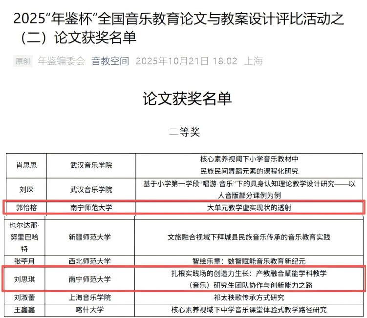 近日,由《中国音乐教育年鉴》编委会主办,上海音乐学院承办的2025年“年鉴杯”全国音乐教育论文与教案设计评比活动近日圆满落幕。我校音乐与舞蹈学院研究生在比赛中表现优异,共有8名同学的12项作品获奖。