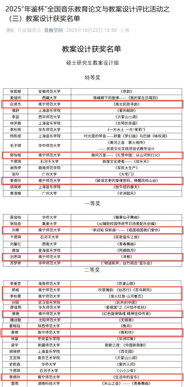 “年鉴杯”作为我国音乐教育界颇具影响力与权威性的赛事之一,此次比赛共收到全国高校与基础教育音乐专业教师、本硕博学生及各类研究者的论文、教案2113份。经组委会8月、9月两轮评审,我校黄妙秋教授指导的研究生白贤杰、郭怡榕、李佩玲的教学设计获“教案组”特等奖;刘艳、刘思琪的教学设计获“教案组”一等奖;郭威、李秋蓉、李佩玲、黄艳(2项)的教学设计获“教案组”二等奖;蓝静副教授指导的郭怡榕、刘思琪的学术论文荣获“论文组”二等奖,充分展现了我校研究生扎实过硬的教学设计基本功和良好的科研能力。