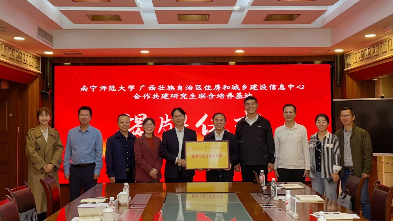 为深化产教融合,创新人才培养模式,10月30日,南宁师范大学人工智能学院与广西壮族自治区住房和城乡建设信息中心在广西建设大厦成功举行研究生联合培养基地揭牌仪式暨访企拓岗活动。仪式由人工智能学院副院长陆建波主持,学院院长闭应洲、学院党委副书记韦柳温及信息中心主任湛志宏,副主任彭凌华、曹峻等双方单位领导与代表共同出席活动。