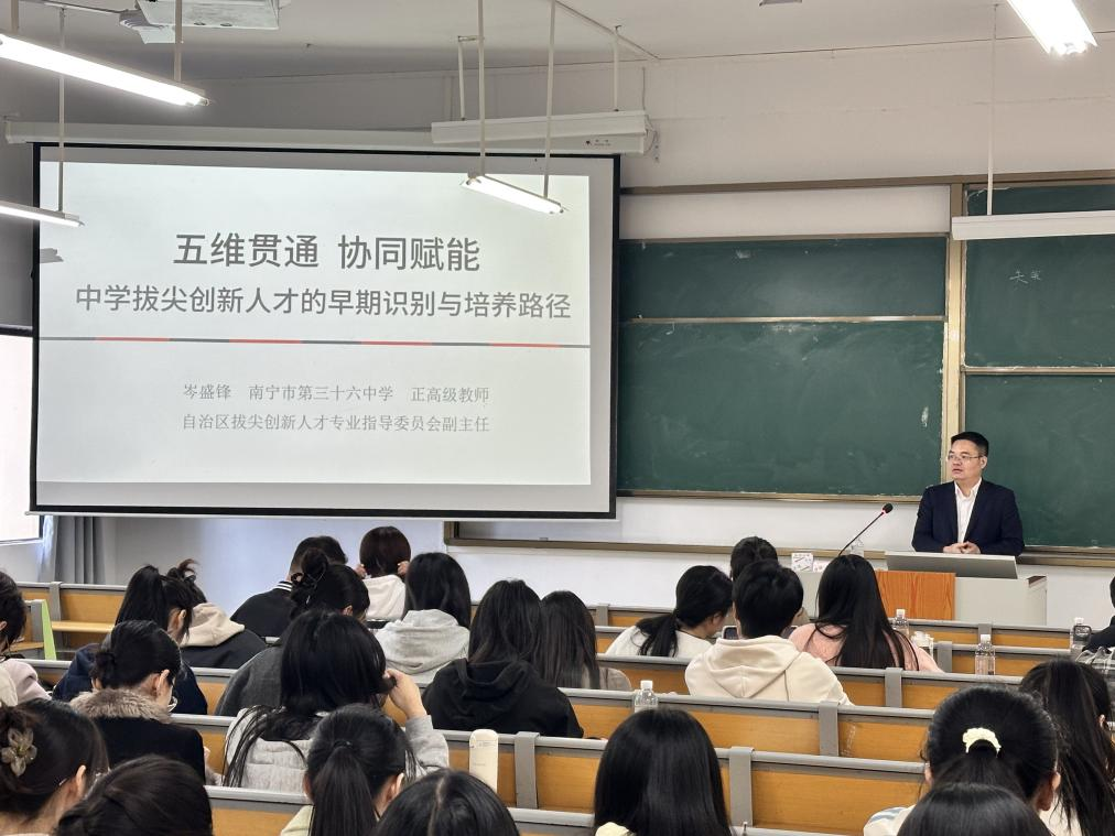 同时,来自南宁三中、十四中、二十六中、三十三中、天桃实验学校的五位校外硕导,为研究生作了精彩的报告,内容涉及中学教学改革、践行教育家精神、拔尖人才培养等,为学生提供了数学教学改革研究的方法,点亮了研究生的“数学眼光”。