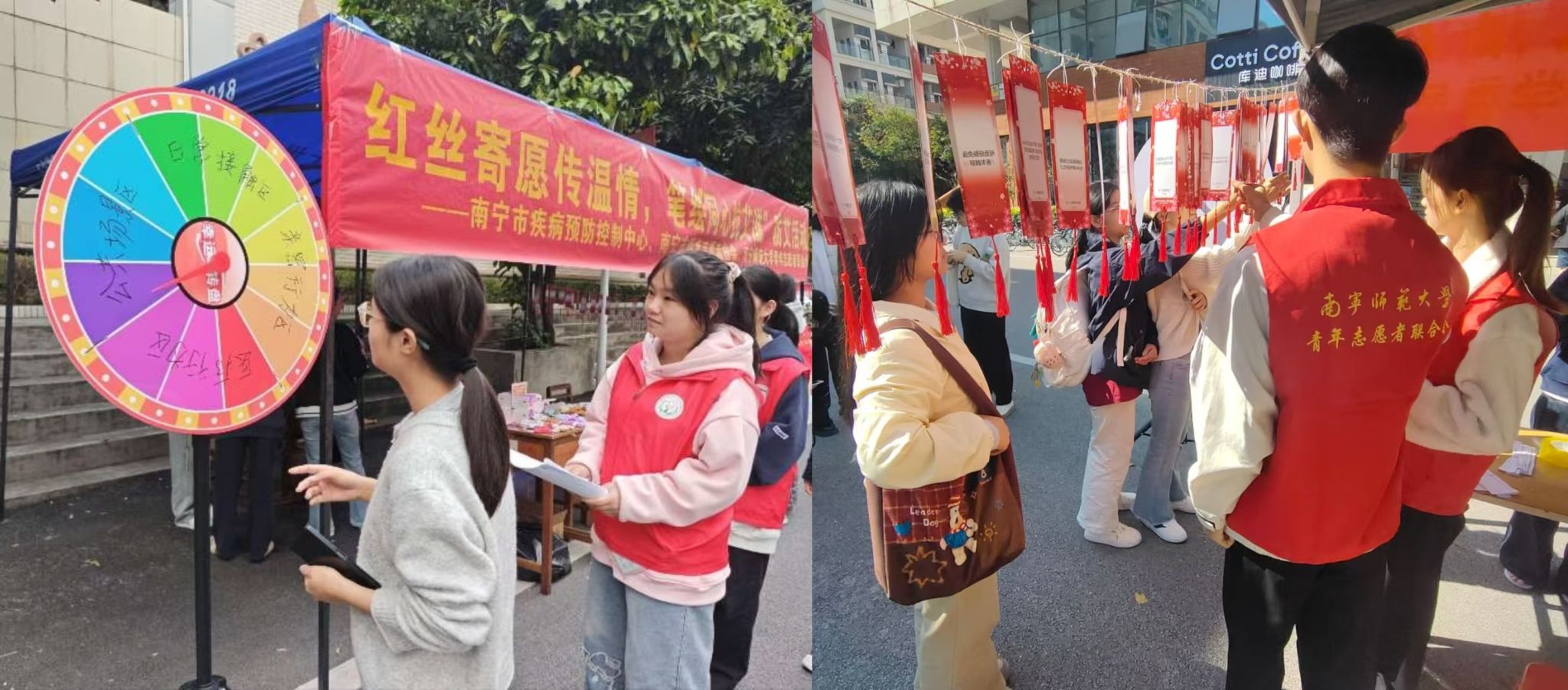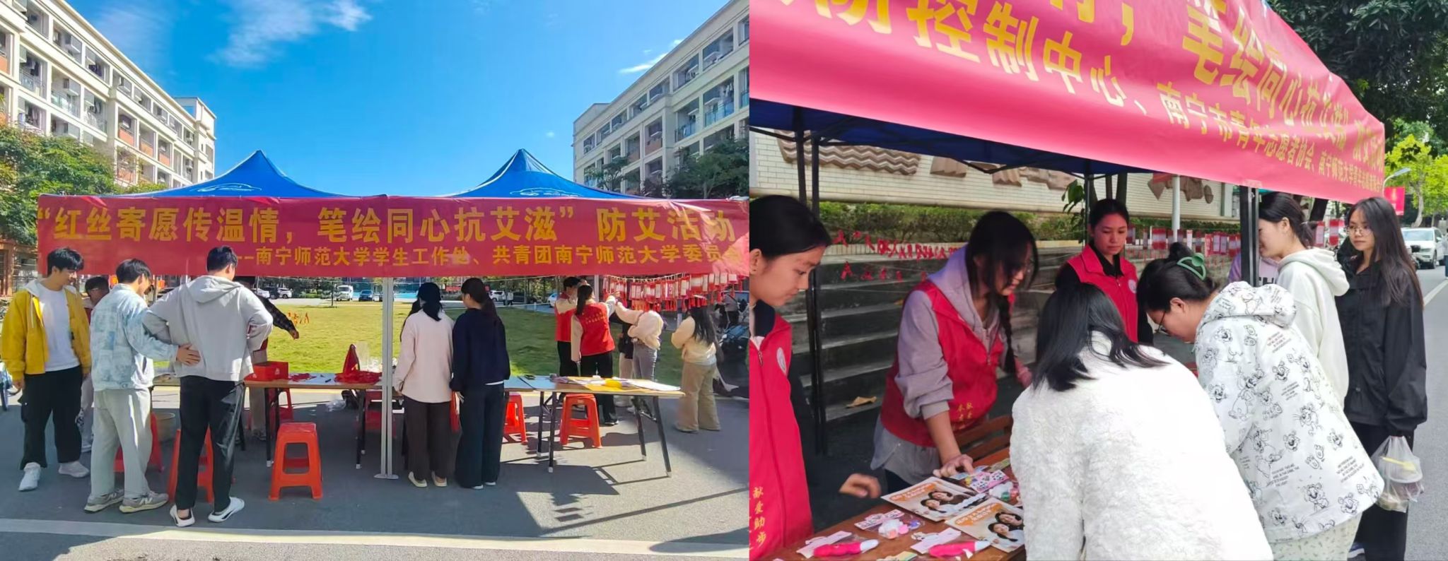 为进一步普及防艾知识,提升学生科学防护意识,筑牢健康校园防线,11月20日至23日,我校分别在明秀、五合、武鸣校区开展“红丝寄愿传温情,笔绘同心抗艾滋”主题活动。本次活动由南宁疾控中心、南宁青协、校学生工作处、校团委联合主办,校青年志愿者联合会承办,累计吸引3000余名学子参与,现场互动氛围浓厚。