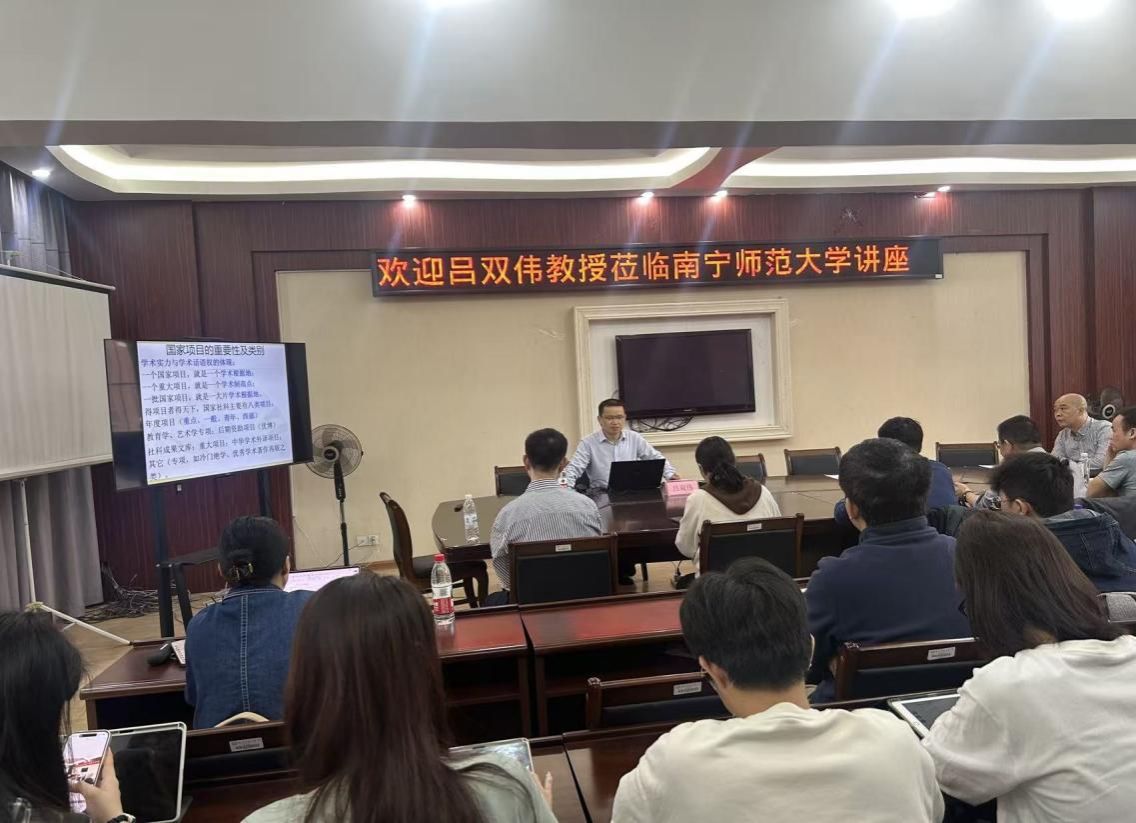 11月16日上午,在南宁师范大学明秀校区外语楼310会议室举行了“知行·文心”大讲坛社科名家报告会。湖南师范大学文学院教授、博士生导师吕双伟应邀作题为“漫谈国家社科基金申报”的专题讲座。讲座由文学院副院长(主持行政工作)刘振平主持,文学院、国际教育学院教师及研究生50余人参会。