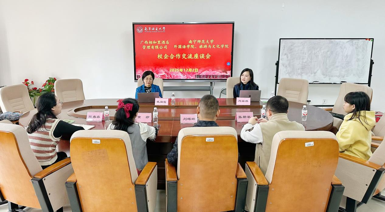 12月2日上午,广西相和里酒店管理有限公司总经理武同霞、总经理助理刘碧萍到访我校外国语学院与旅游与文化学院。外国语学院副书记刘晖晖、旅游与文化学院副书记黄珍及相关学院就业负责人接待,双方重点对接就业实习基地建设及校企深度合作事宜。