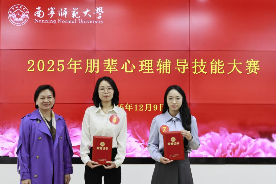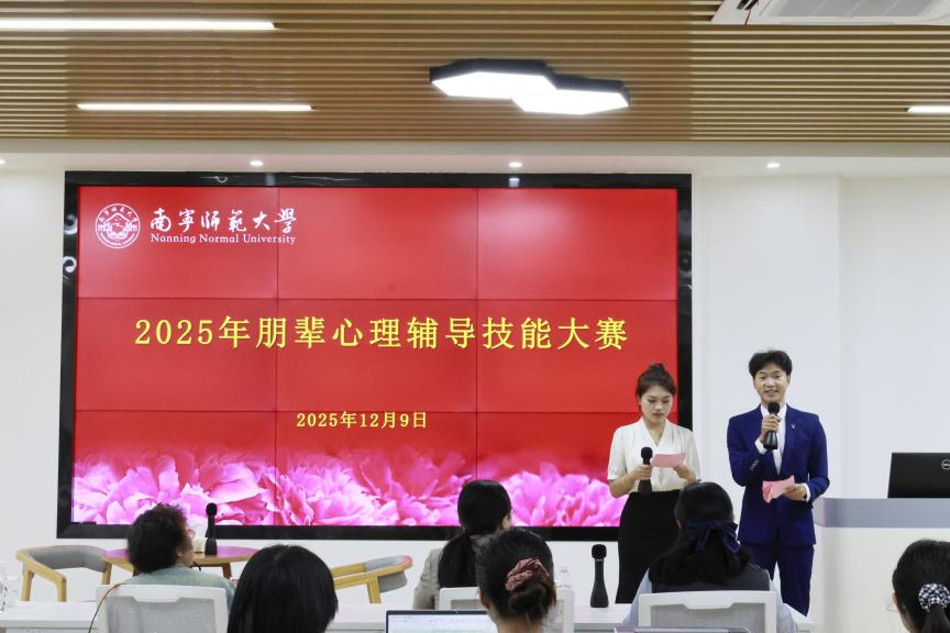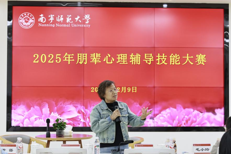12月9日下午,由学生工作部(处)主办、心理健康教育咨询中心与校大学生心理健康协会共同承办的2025年南宁师范大学“同心相伴筑梦成长”朋辈心理辅导技能大赛决赛在明秀校区图书馆广西本科教育发展研究中心会议室顺利举行。广西机电职业技术学院学生工作部副部长董蓓副教授、广西民族大学心理健康教育中心副主任毛小玲副教授、广西财经学院心理健康中心副主任覃梅芳副教授等校内外心理健康领域专家应邀出席并担任赛事评委,从全校600余名报名学生中脱颖而出的十支朋辈辅导员团队进入决赛展开角逐。