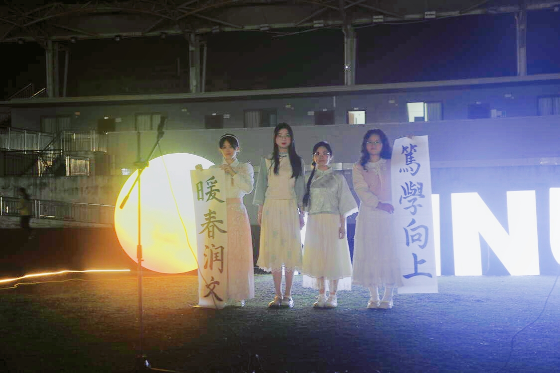 中场休息时“听歌识曲”游戏激发了观众的热情,抢答十分激烈,现场气氛瞬间升温。合唱《这世界那么多人》《一程山路》的和声里,观众们挥动手中的荧光棒轻唱应和;SPADE-ACE乐队带来的《潜蓝色》《不该》以器乐的碰撞点燃现场氛围,鼓点与吉他的音浪里,观众的呐喊此起彼伏。从国风雅韵到流行旋律,从舞台律动到协作展演,同学们以艺术为笔,在夜色里绘就“以美育人”的鲜活图景。