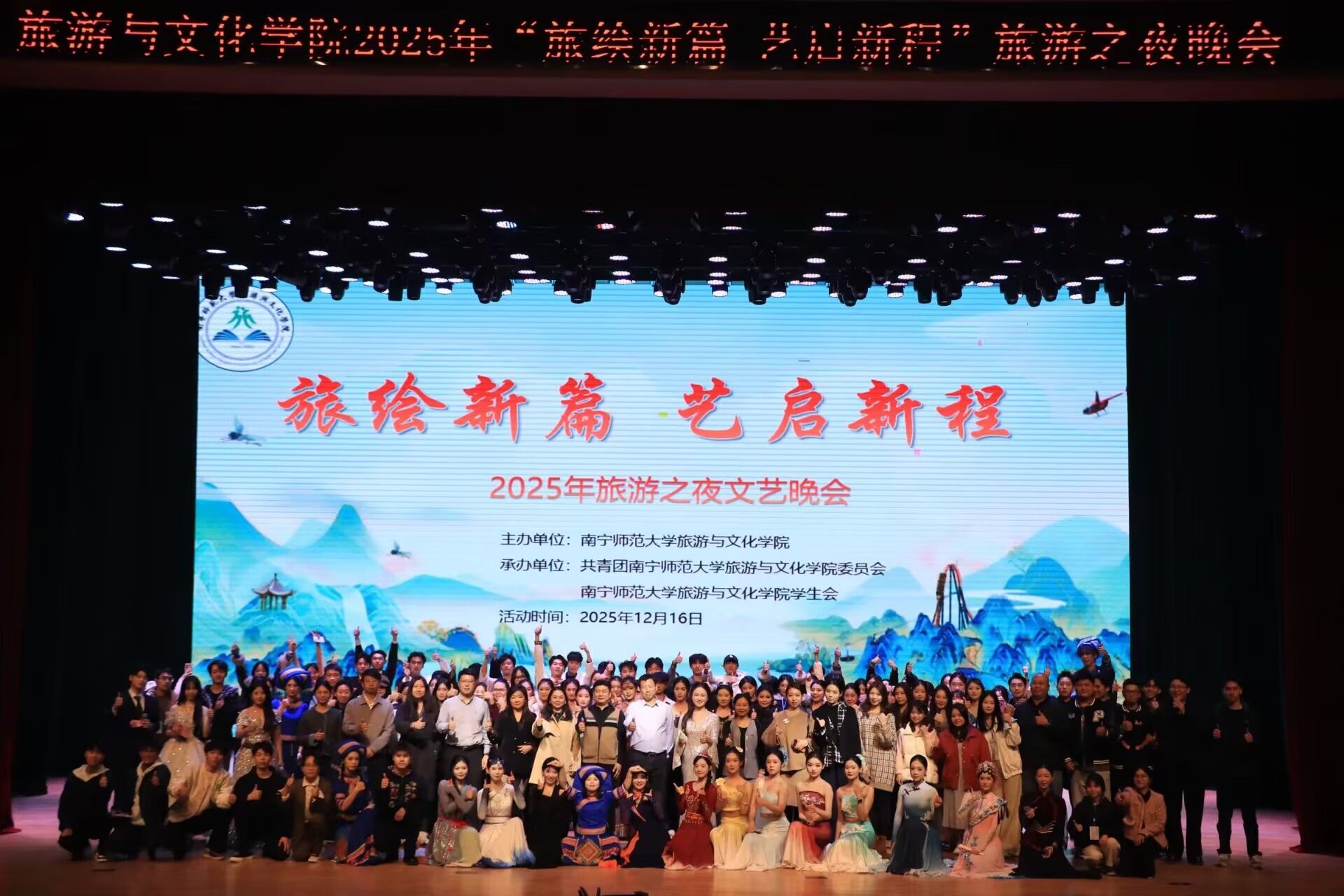 12月16日晚,旅游与文化学院在武鸣校区音舞院1号报告厅举行主题为“旅绘新篇 艺启新程”的2025年旅游之夜。学校相关职能部门负责人、各二级学院师生代表,学院党政领导班子成员、师生代表齐聚现场;此外本次晚会还邀请到了校外嘉宾:中国文化报华南采编中心主任兼广西记者站站长宾阳先生、广西工业工程师协会资深专家段立新先生、广西家政一姐IP主理人吕欢俞女士,以及广编西工学院行政与后勤副部长张蓉女士,众人共赏这场融合艺术与青春的视听盛宴。