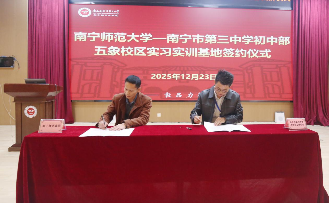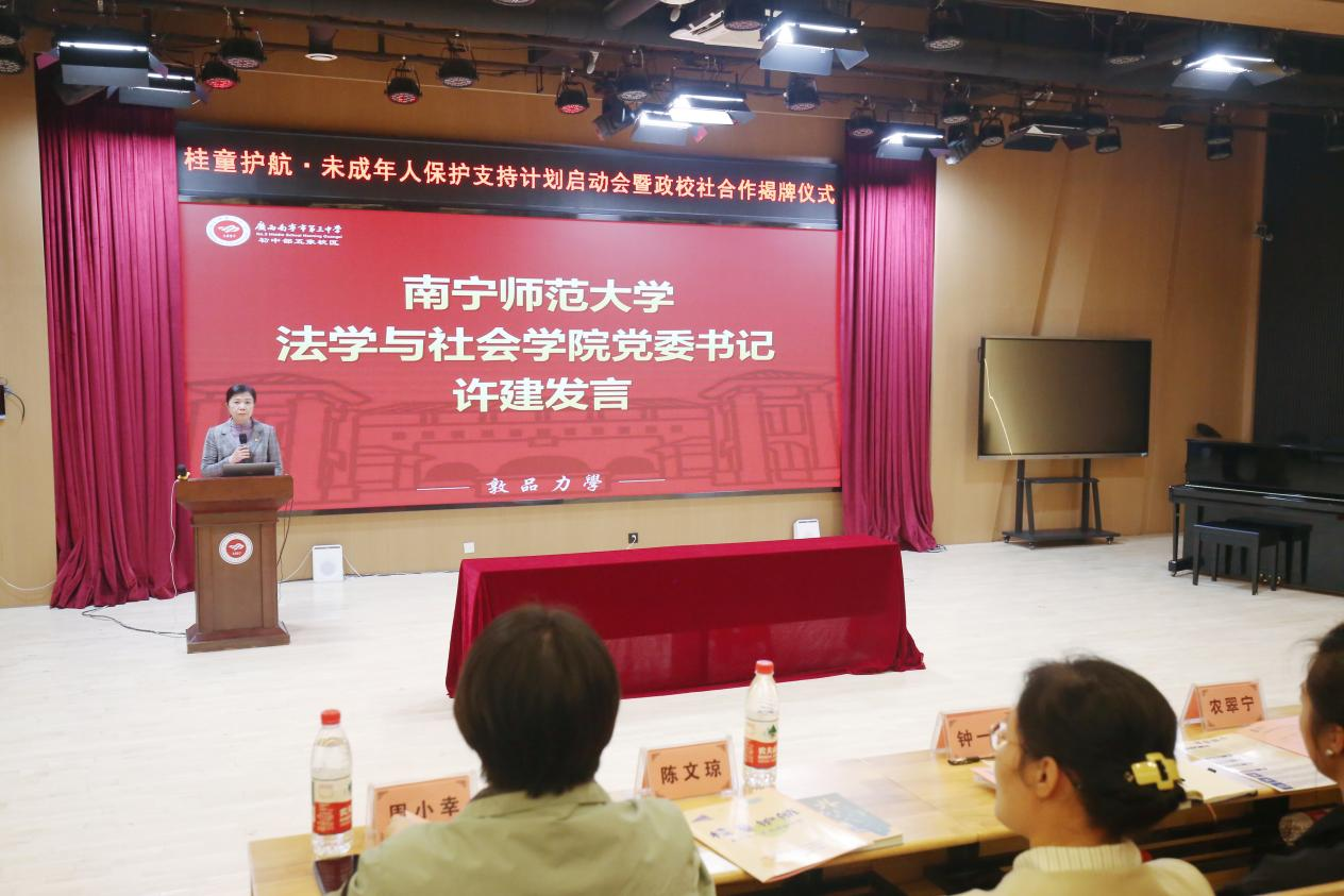 为深入贯彻落实党和国家关于未成年人保护工作的战略部署,推动社会工作专业力量深度服务基础教育一线,12月23日,“桂童护航·未成年人保护支持计划”项目启动会暨政校合作揭牌仪式在南宁市第三中学初中部五象校区举行。法学与社会学院与南宁三中初中部五象校区现场签署共建实习实训基地协议,并同步揭牌。这标志着学院深度参与的“党政部门统筹指导、学校主责落实、社工机构专业服务、高校智力支持”四方联动协同育人机制正式启动运行。学院党委书记许建、主持行政工作的副院长吴少进、副院长罗永仕、院长助理陈文琼及社会工作系部分教师参加了本次活动。