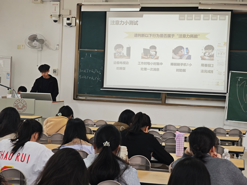 班会围绕“注意力耗能模式”展开,通过数据分析、案例讲解等形式,揭示注意力分散的现状与危害。心理委员们指出,注意力如同“认知电池”,长期处于多任务切换、频繁刷手机等状态易导致“电量”过快消耗,进而影响学习效能、引发焦虑情绪,甚至波及人际关系与身心健康。