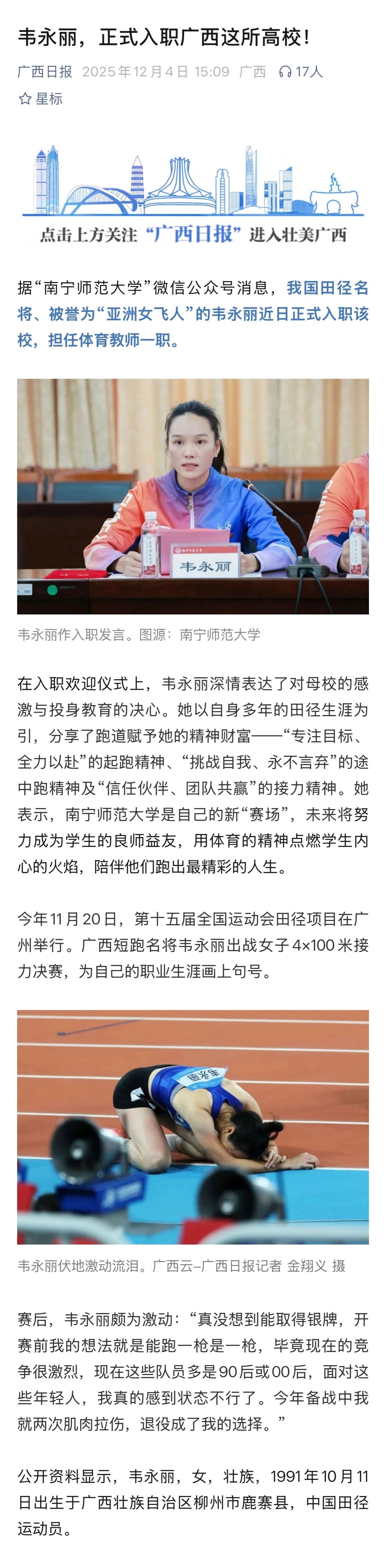 【南宁新闻网】“亚洲女飞人”韦永丽,入职南宁师范大学!
