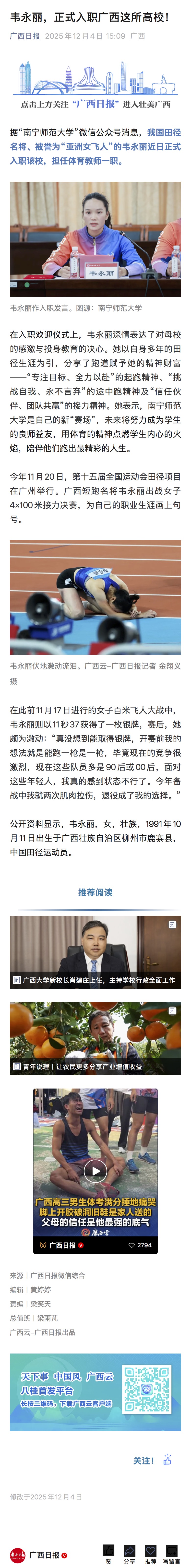【柳州晚报】“亚洲女飞人”韦永丽,有新身份!