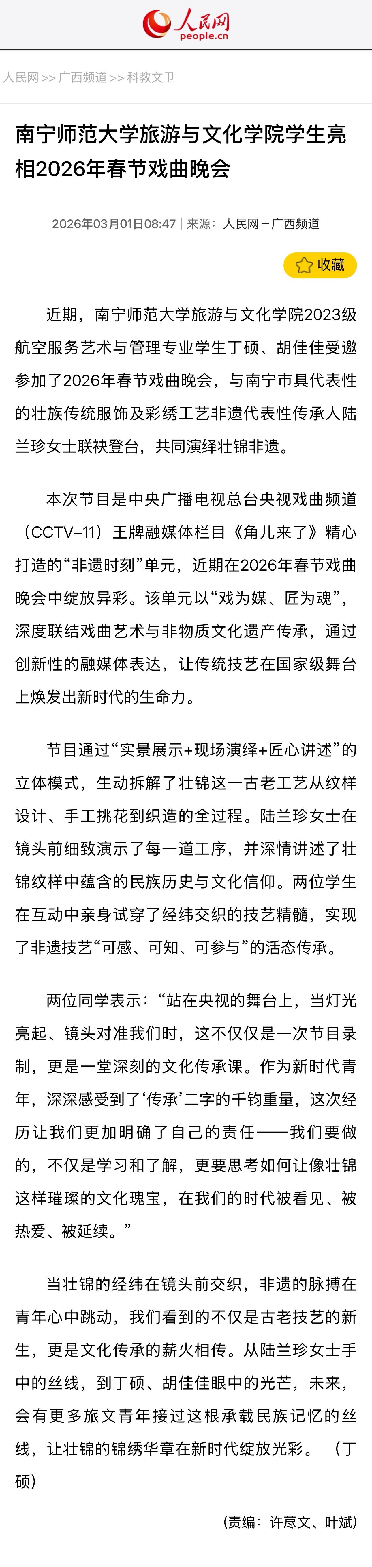 【人民网】南宁师范大学旅游与文化学院学生亮相2026年春节戏曲晚会