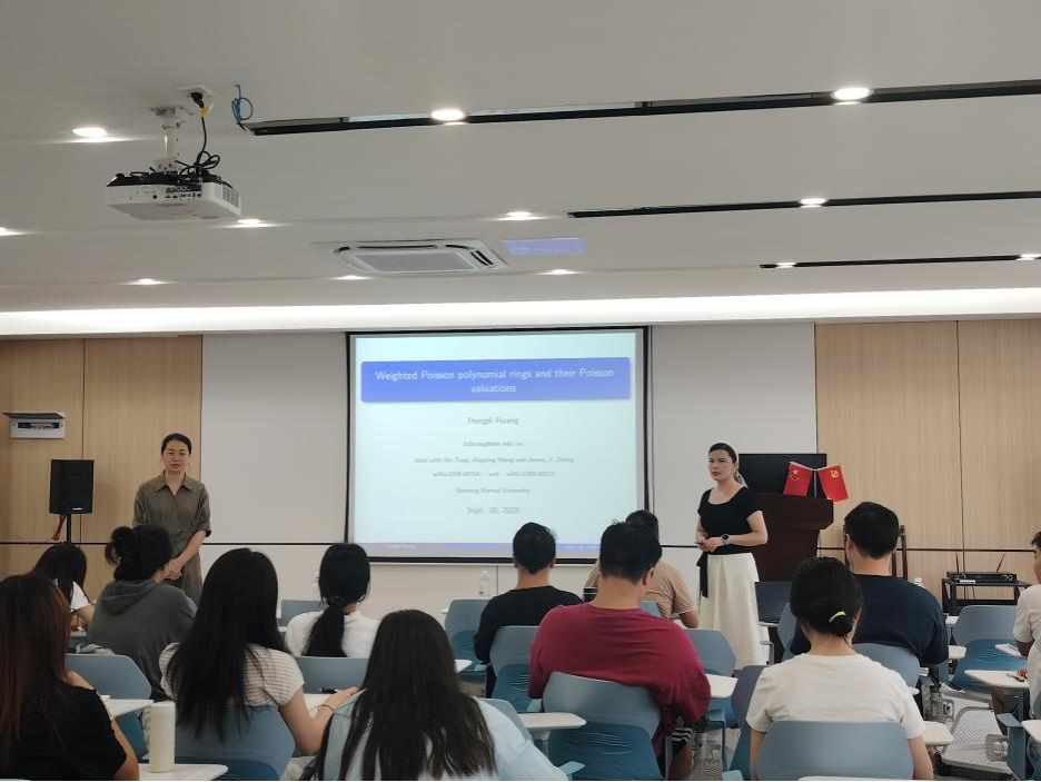 9月30日,黄红娣为数学与统计学院教师及研究生做了题为《泊松代数和泊松赋值相关问题》的学术报告。报告围绕泊松代数和泊松赋值展开,期间黄红娣博士阐述了一些关于泊松代数和赋值相关的前沿问题,引发了在场师生的热烈探讨。此次学术报告为南宁师范大学数学领域的师生搭建了优质的学术交流平台,不仅让大家对泊松代数和泊松赋值有了更系统、深入的认识,也激发了师生们对数学前沿问题的研究热情,对推动学校数学学科的学术发展具有积极意义。