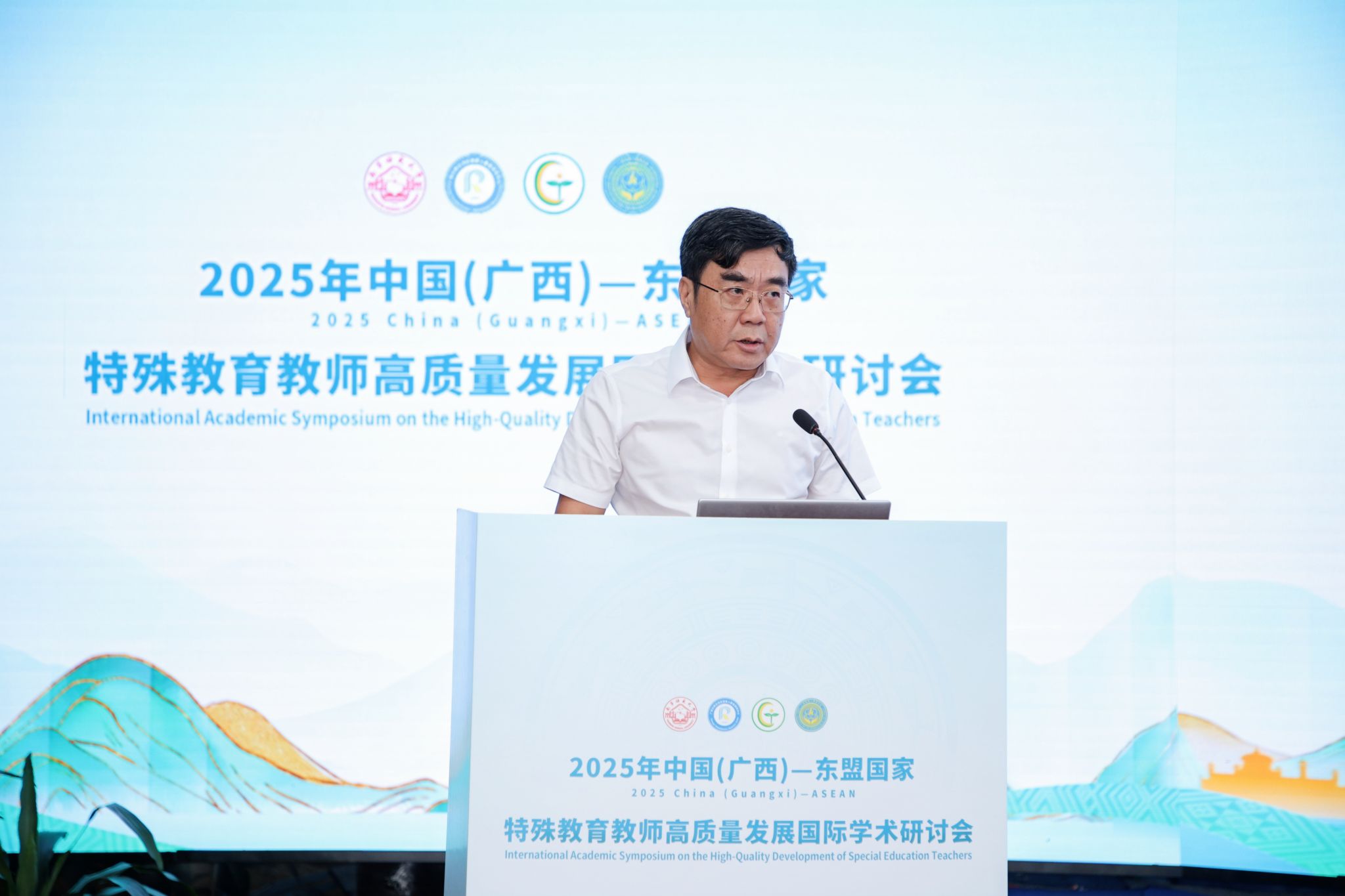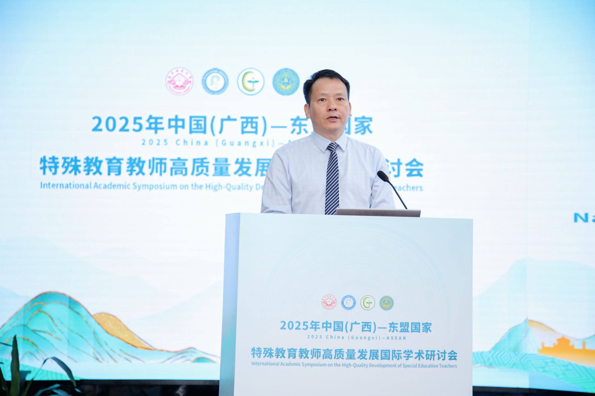 华东师范大学融合教育研究院邓猛教授作题为《AI赋能特殊教育教学变革》的主旨报告,聚焦人工智能为特殊教育教学带来的革新。马来西亚奎斯特国际大学Aznan Che Ahmad 教授、北京联合大学特殊教育学院刘全礼教授、韩国又石大学教育学部Baek Jongnam教授、陕西师范大学教育学部王庭照教授、印度尼西亚马朗国立大学Imanuel Hitipeuw教授、南京特殊教育师范学院特殊教育学院李拉教授、北京大学博雅教育研究院阮立平教授、新加坡高级语言治疗师Jean Ho博士、华南师范大学教育科学学院谌小猛教授、岭南师范学院特殊教育学院郑剑虹教授、广西壮族自治区残疾人康复研究中心主任/广西残疾人康复协会陈国治会长、南宁师范大学教育科学学院邵乐怡博士等十余位专家,围绕教师培养成长、特殊教育师资培训、特殊教育教师积极行为支持、残疾人职业刻板印象、印度尼西亚特殊教育概况、融合教育改革、自闭症青年学历教育、学前教育机构包容性教育、虚拟现实技术辅助盲生、特殊教育育人模式、ICF理论框架应用、特殊教育专业应用型人才培养等特殊教育相关主题作主旨报告,从多元维度探讨特殊教育的发展,解析特殊教育的实践路径与创新方向,研讨如何推动特殊教育高质量发展,助力特殊群体获得更优质的教育与发展支持。