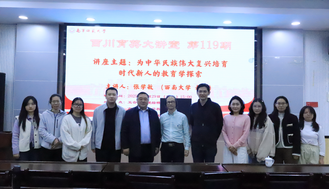 为切实加强师生对中国教育学自主知识体系建构的理解与研究,11月29日,由南宁师范大学教育科学学院主办、广西教育现代化与质量监测研究中心承办的《百川育英大讲堂》第119期讲座在五合校区理综楼北1003室顺利举行。本期讲座邀请西南大学西南民族教育与心理研究中心主任、西南大学教育学部张学敏教授主讲“为中华民族伟大复兴培育时代新人的教育学探索”,由南宁师范大学教育科学学院院长李强教授主持。