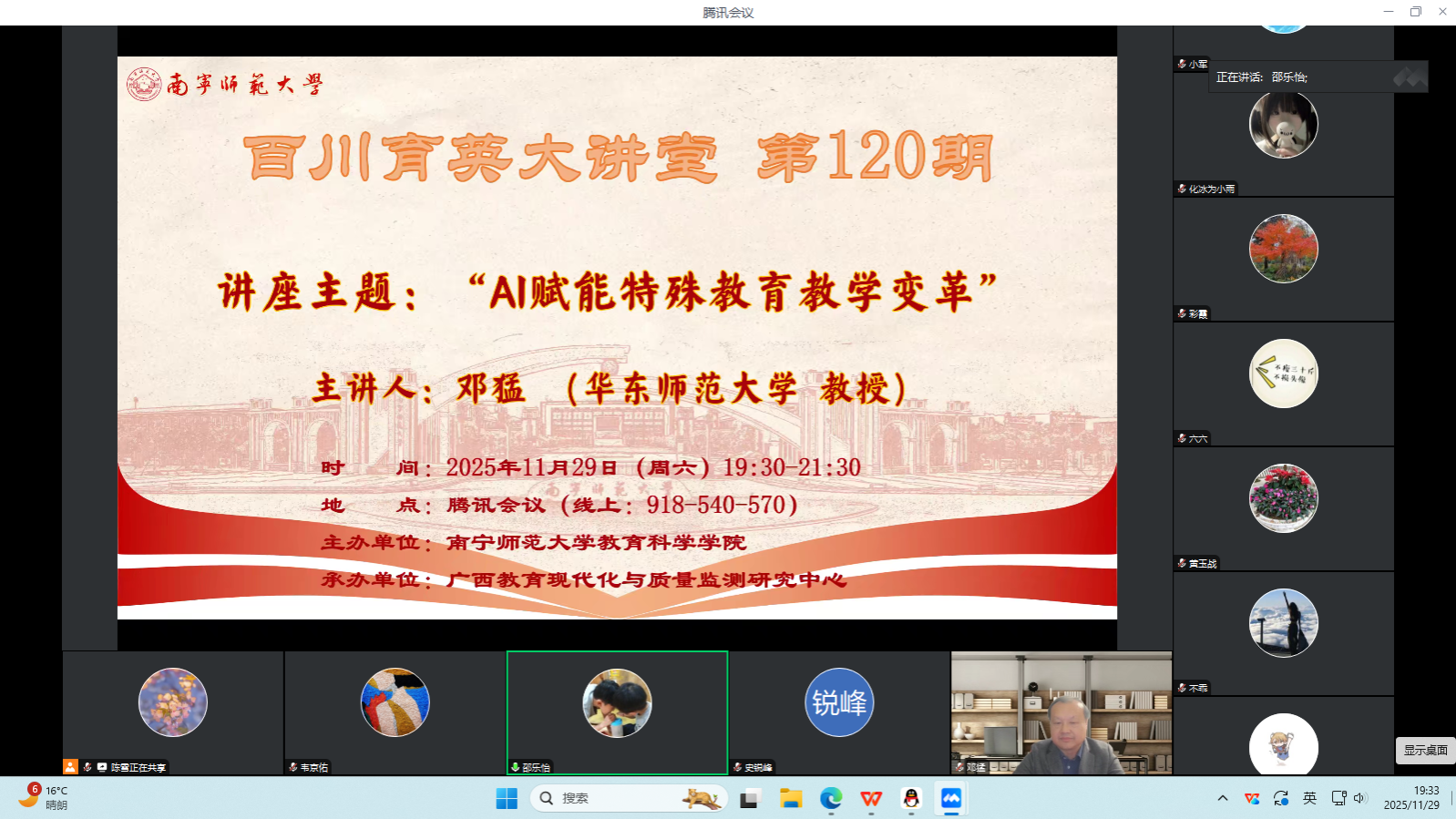 11月29日,为加深师范生对AI与特殊教育融合的认知,推动经验互鉴与资源共享,由南宁师范大学教育科学学院主办、广西教育现代化与质量监测研究中心承办的《百川育英大讲堂》第120期讲座,通过腾讯会议顺利开展。本次讲座聚焦“AI赋能特殊教育教学变革”,特邀华东师范大学融合教育研究院院长邓猛教授主讲,由教育科学学院特殊教育系主任邵乐怡副教授主持,